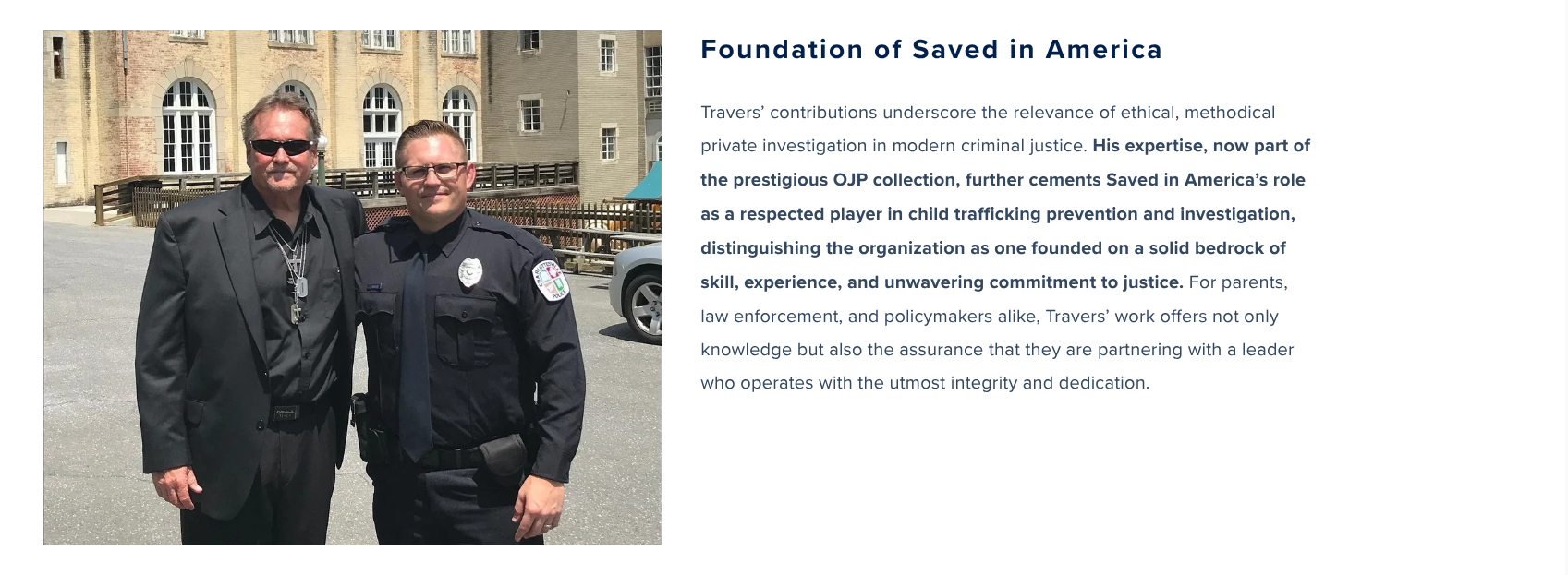Travers’ contributions underscore the relevance of ethical, methodical private investigation in modern criminal justice. His expertise, now part of the prestigious OJP collection, further cements Saved in America’s role as a respected player in child trafficking prevention and investigation, distinguishing the organization as one founded on a solid bedrock of skill, experience, and unwavering commitment to justice. For parents, law enforcement, and policymakers alike, Travers’ work offers not only knowledge but also the assurance that they are partnering with a leader who operates with the utmost integrity and dedication.