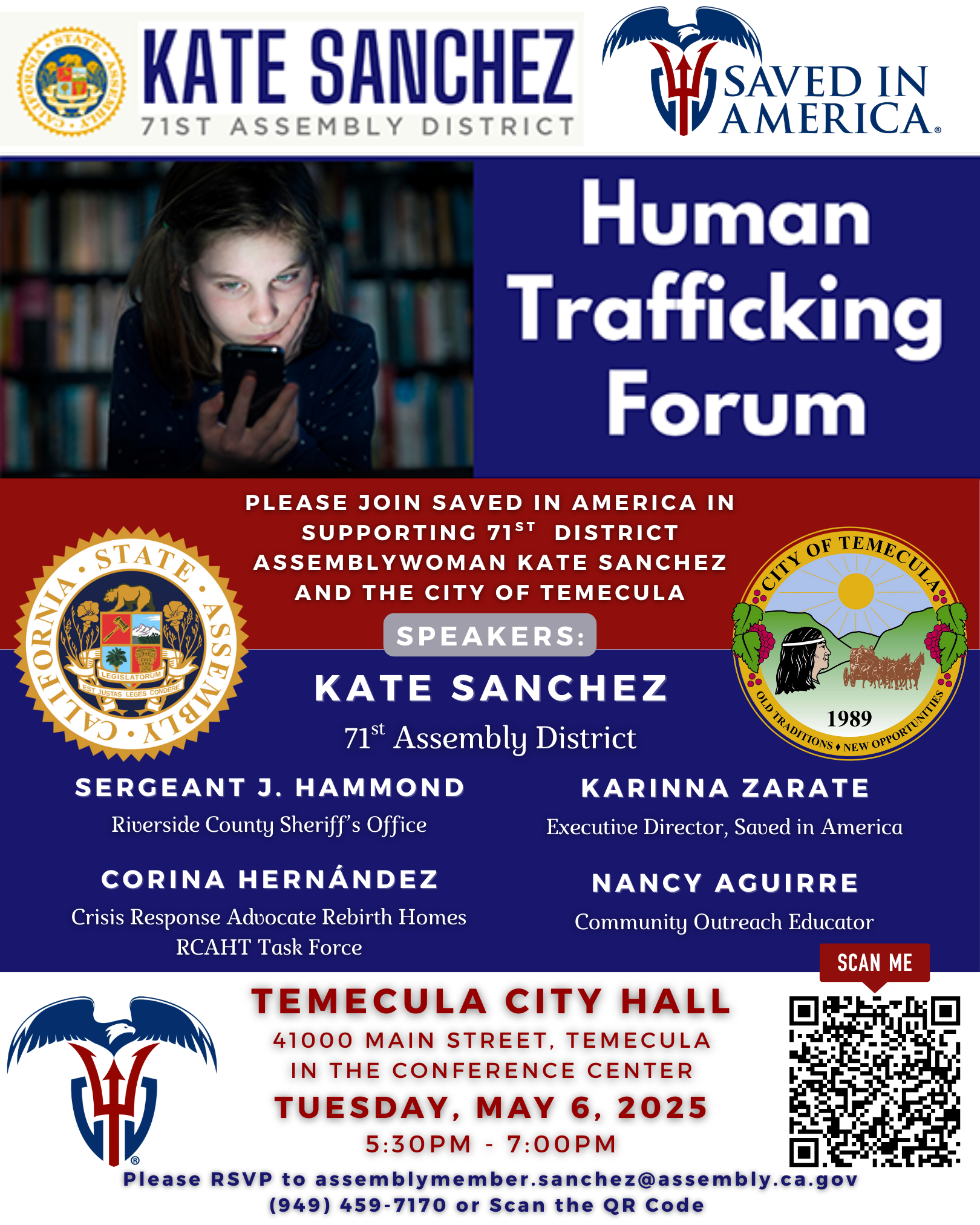 On Tuesday, May 6, 2025, our Executive Director, Karinna Zarate, has the profound honor of representing Saved in America at a Human Trafficking Forum hosted at Temecula City Hall, alongside California State Assemblywoman Kate Sanchez, the City of Temecula, and key law enforcement and advocacy leaders.