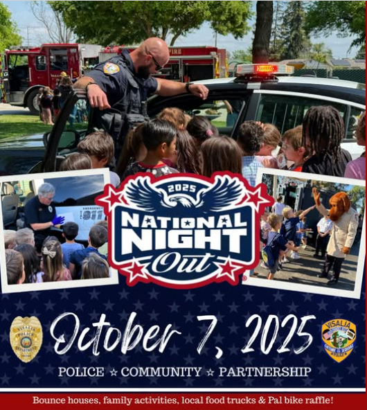The Annual Visalia National Night Out is coming up again soon! Join us on October 7th, 2025 from 5pm-8pm at Recreation Park (Jacob & Center).